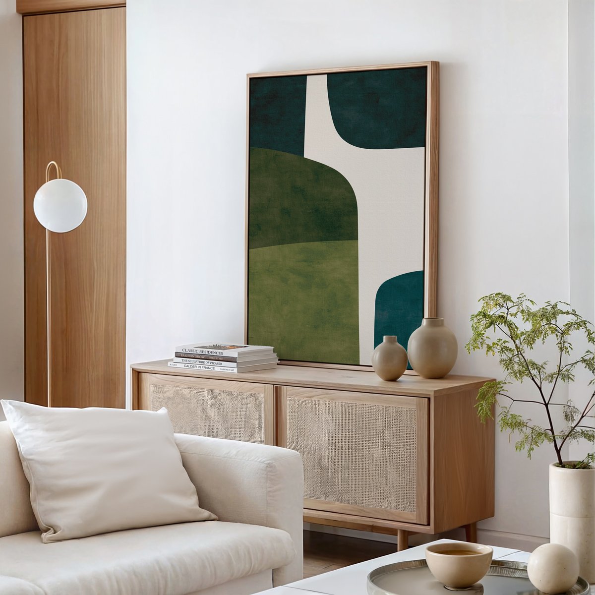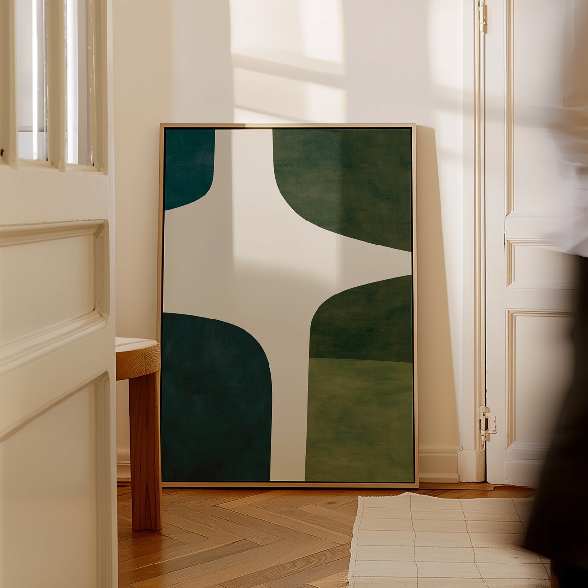 יצירת אמנות ממוסגרת במסגרת צפה אלגנטית, המעניקה ליצירה מראה מרחף ויוקרתי
